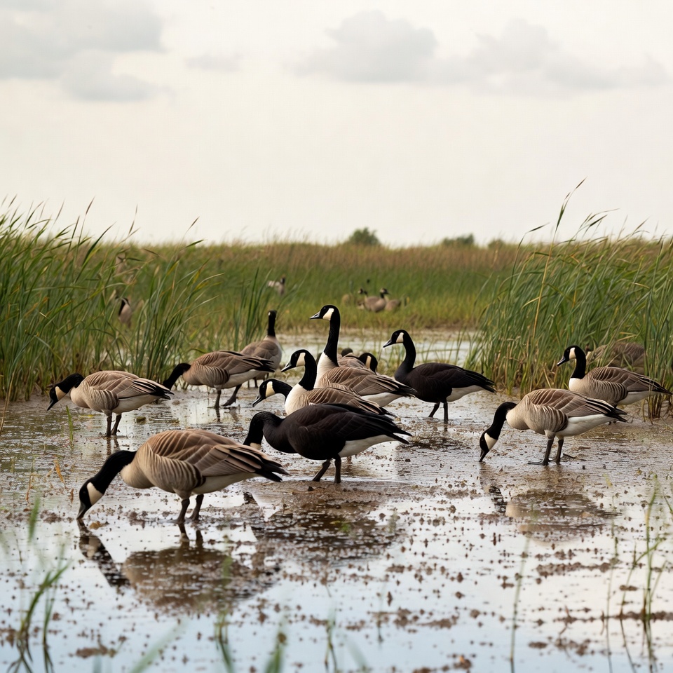 Geese feeding in wetland marsh
