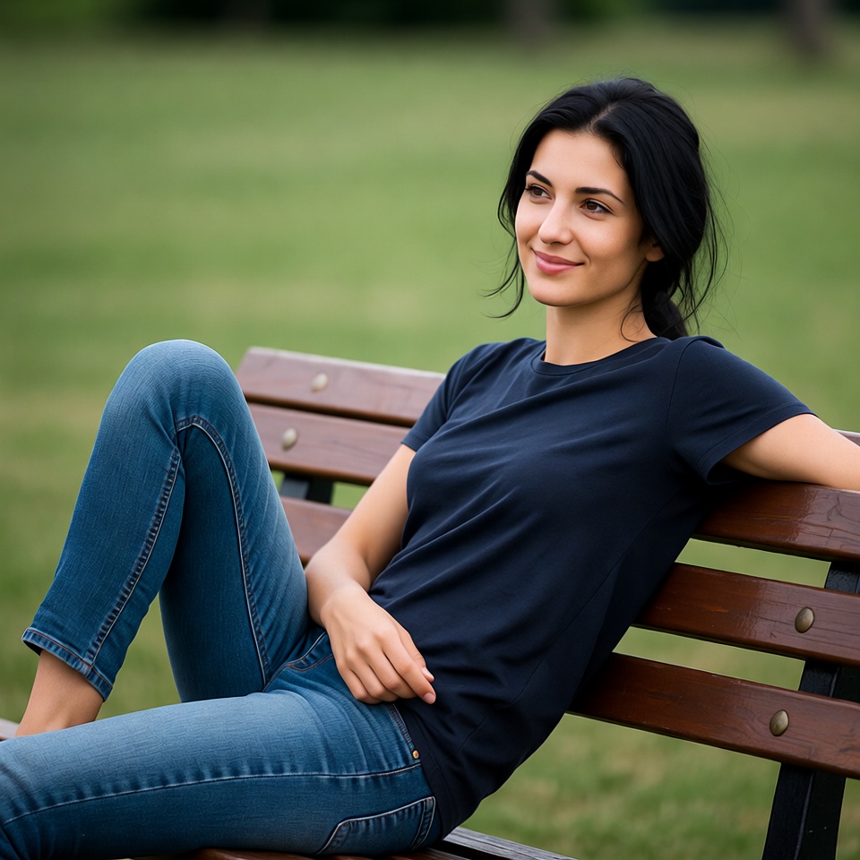 A woman relaxes on a park bench wearing a simple outfit. She looks thoughtful while enjoying the outdoor setting on a sunny day.