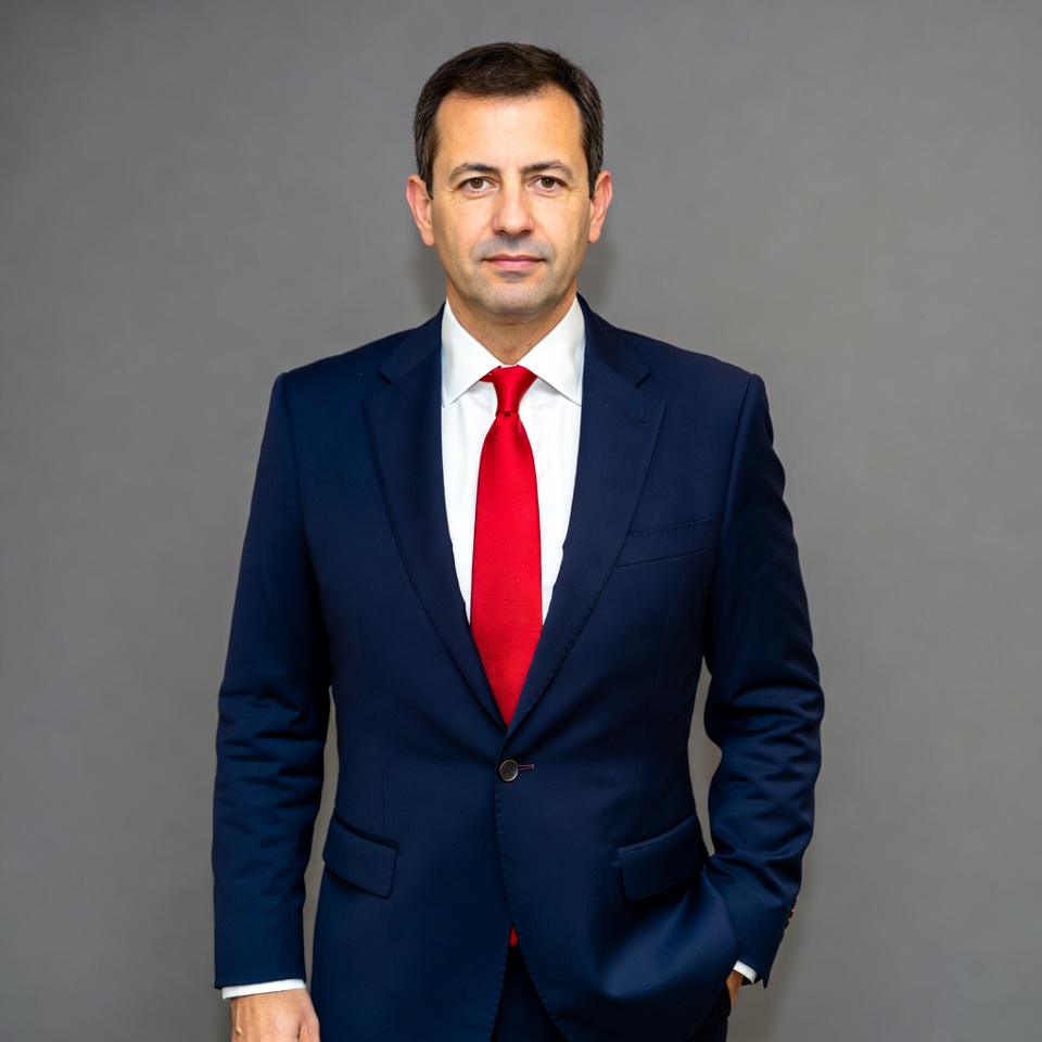 A businessman stands confidently in a dark suit and red tie. He has a serious expression while posing against a gray background.