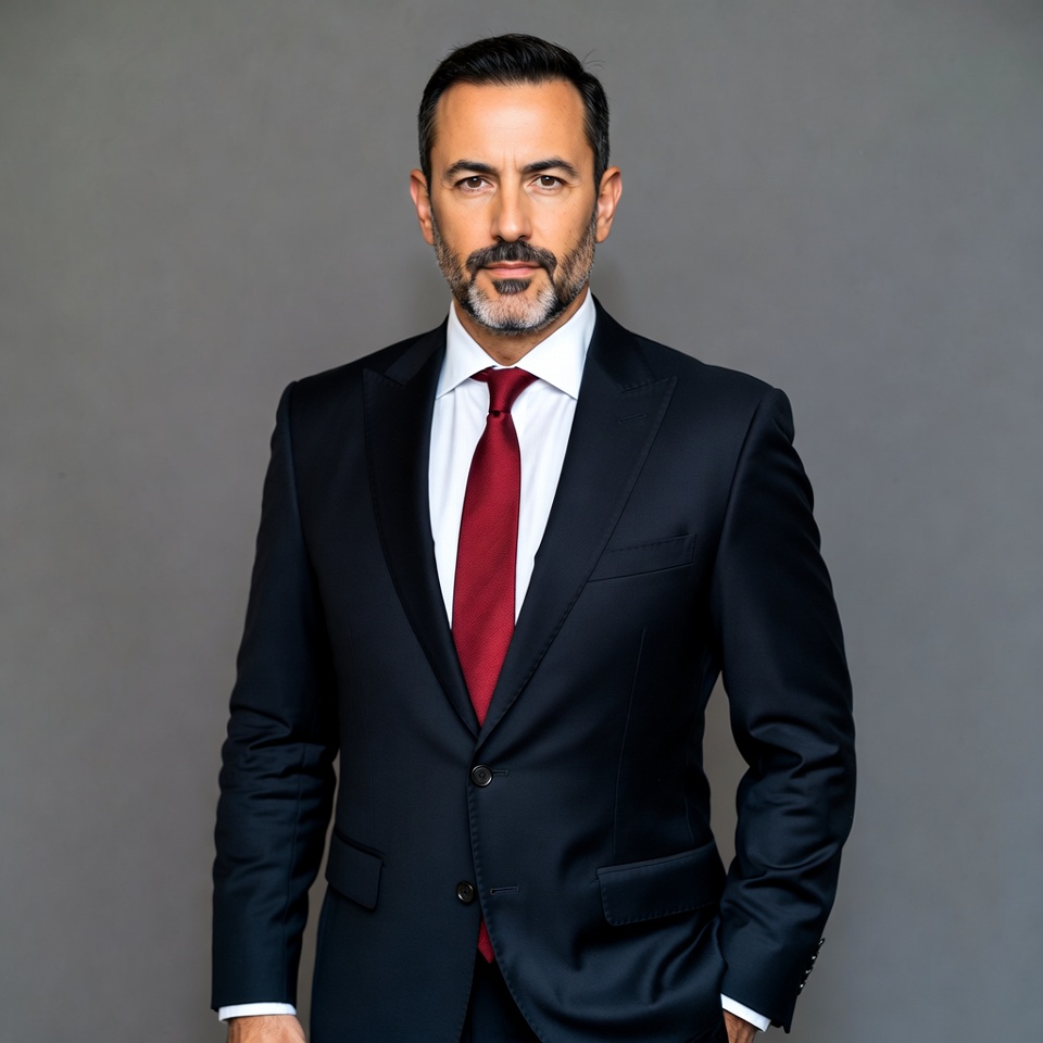 A businessman poses in formal attire against a plain background. He stands with confidence and has a serious expression on his face.
