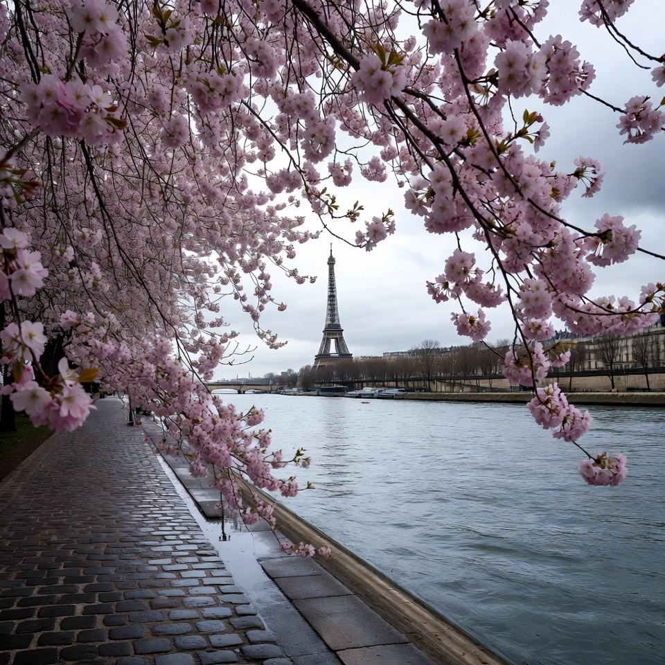 Cherry blossom trees line the Seine River near the Eiffel Tower in Paris. The flowers bloom under a cloudy sky, creating a scenic view.