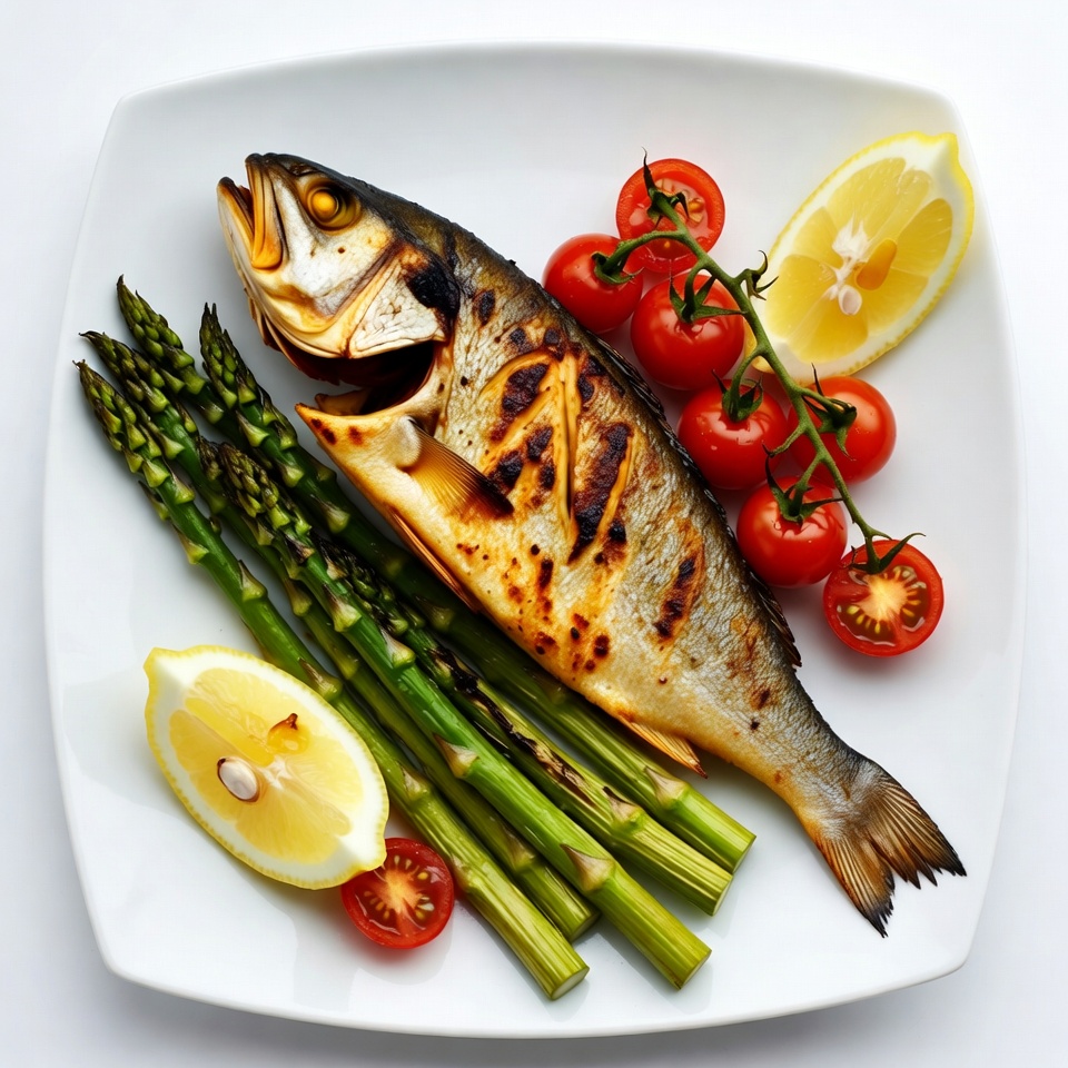 A grilled fish is placed on a white plate next to asparagus, tomatoes, and lemon slices. The meal looks fresh and is ready to eat.