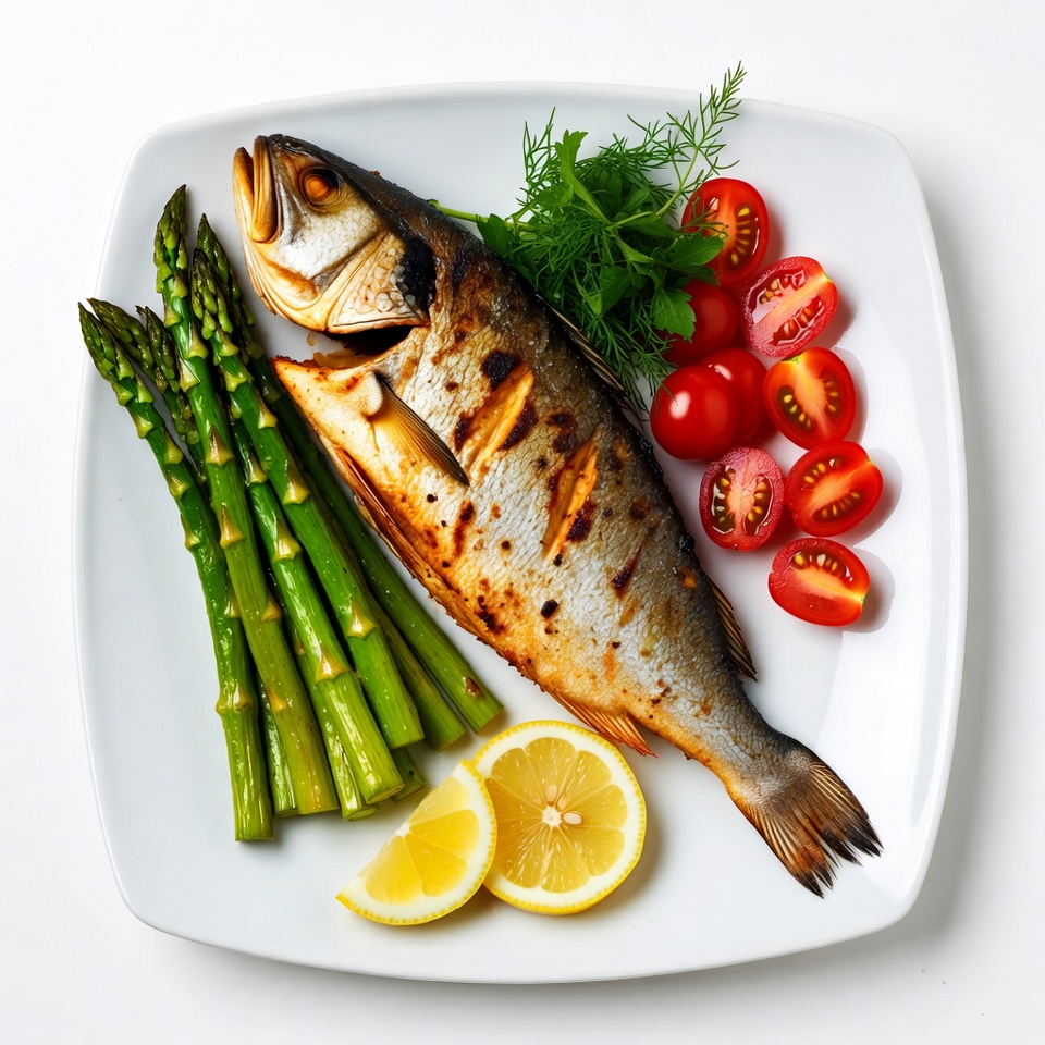 A plate holds grilled fish, asparagus, cherry tomatoes, and lemon slices. The dish combines fresh and colorful ingredients ready to eat.