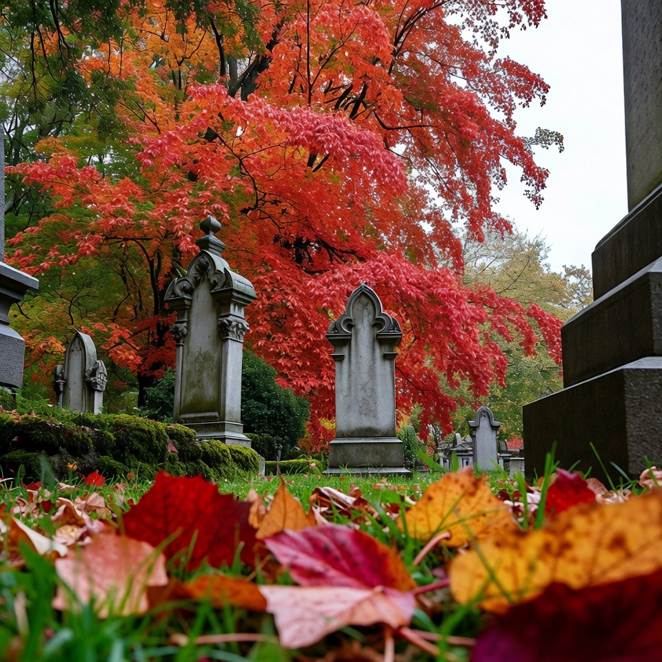 Colorful fallen leaves cover graves in a cemetery. Red and orange trees stand in the background during autumn season.