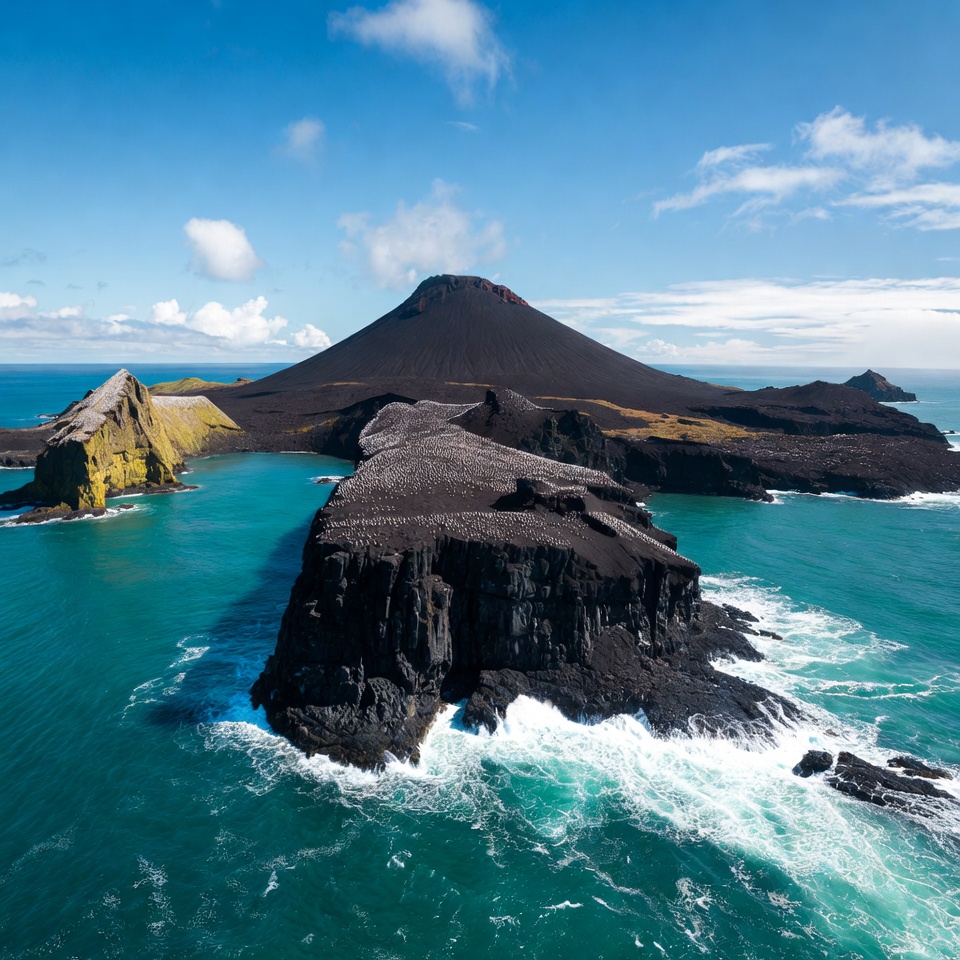 A volcanic island rises above the ocean. Dark rock contrasts with bright blue water. Waves crash against the shore under a clear sky.