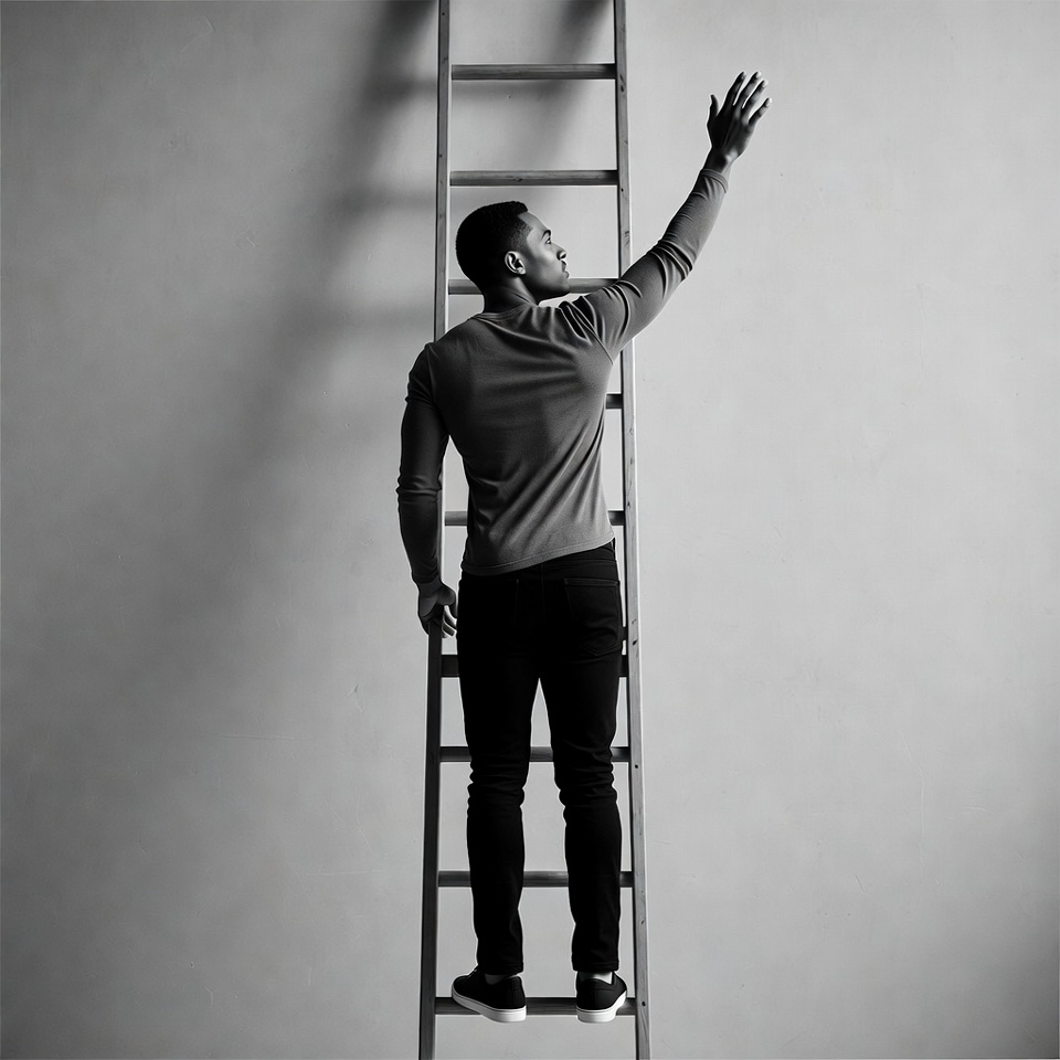 A person climbs a ladder and reaches toward the wall, exploring a creative space while focusing on the task ahead.