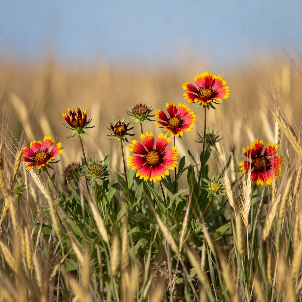 Colorful flowers grow among tall wheat stalks under a clear sky. They bloom in a vibrant mix of red and yellow colors.
