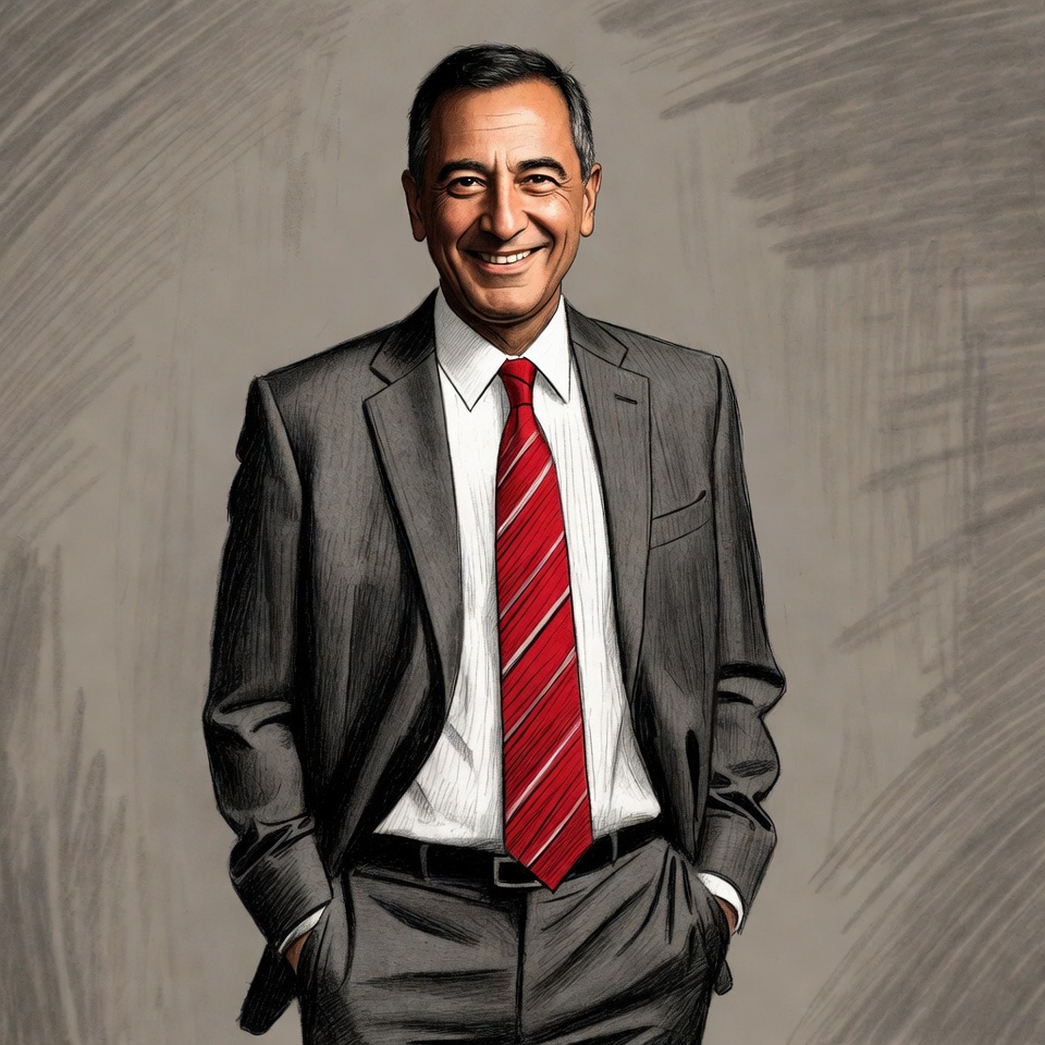 A businessman stands with hands in pockets, smiling. He wears a suit and tie. The background is simple, focusing on his confident pose.