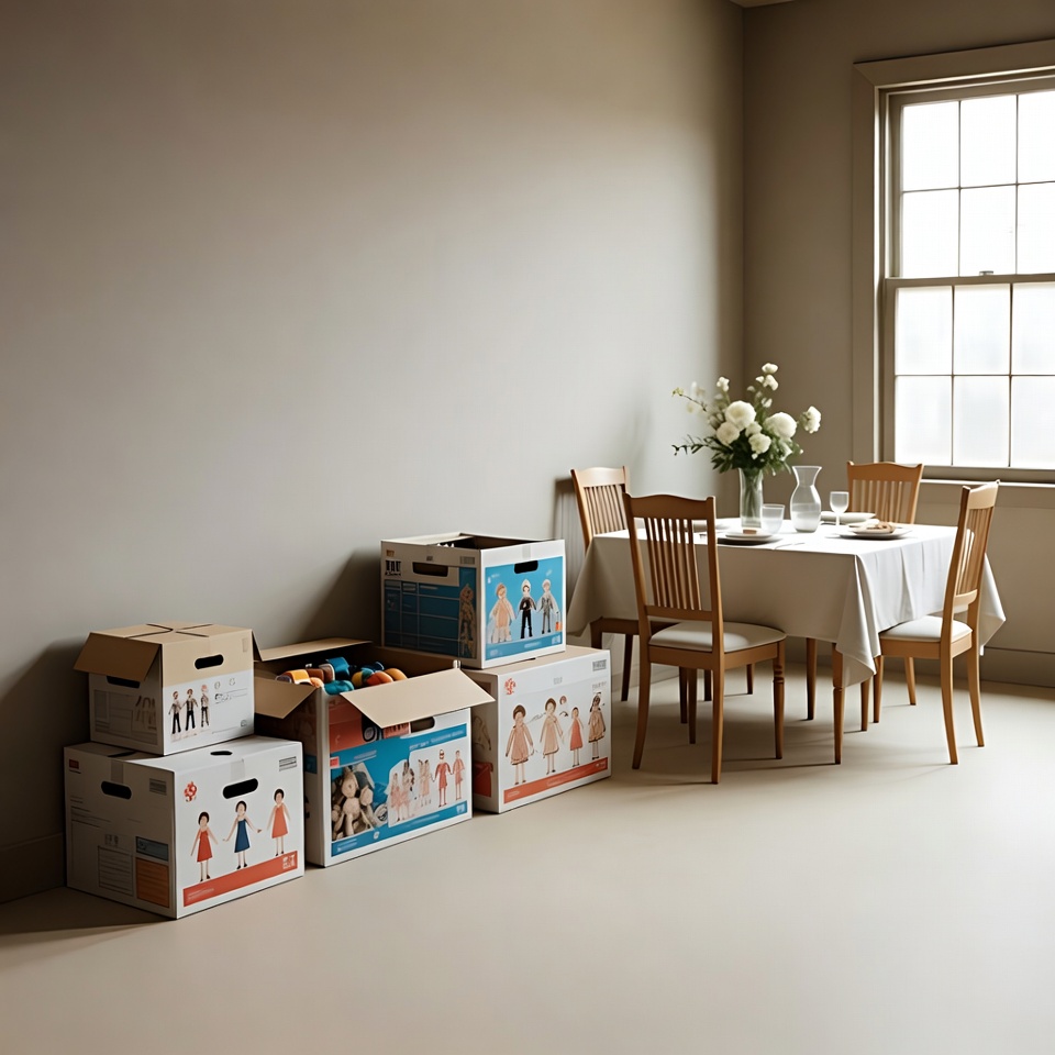 Boxes sit on the floor next to a table set with vases and flowers. Light enters through a window, filling the room.