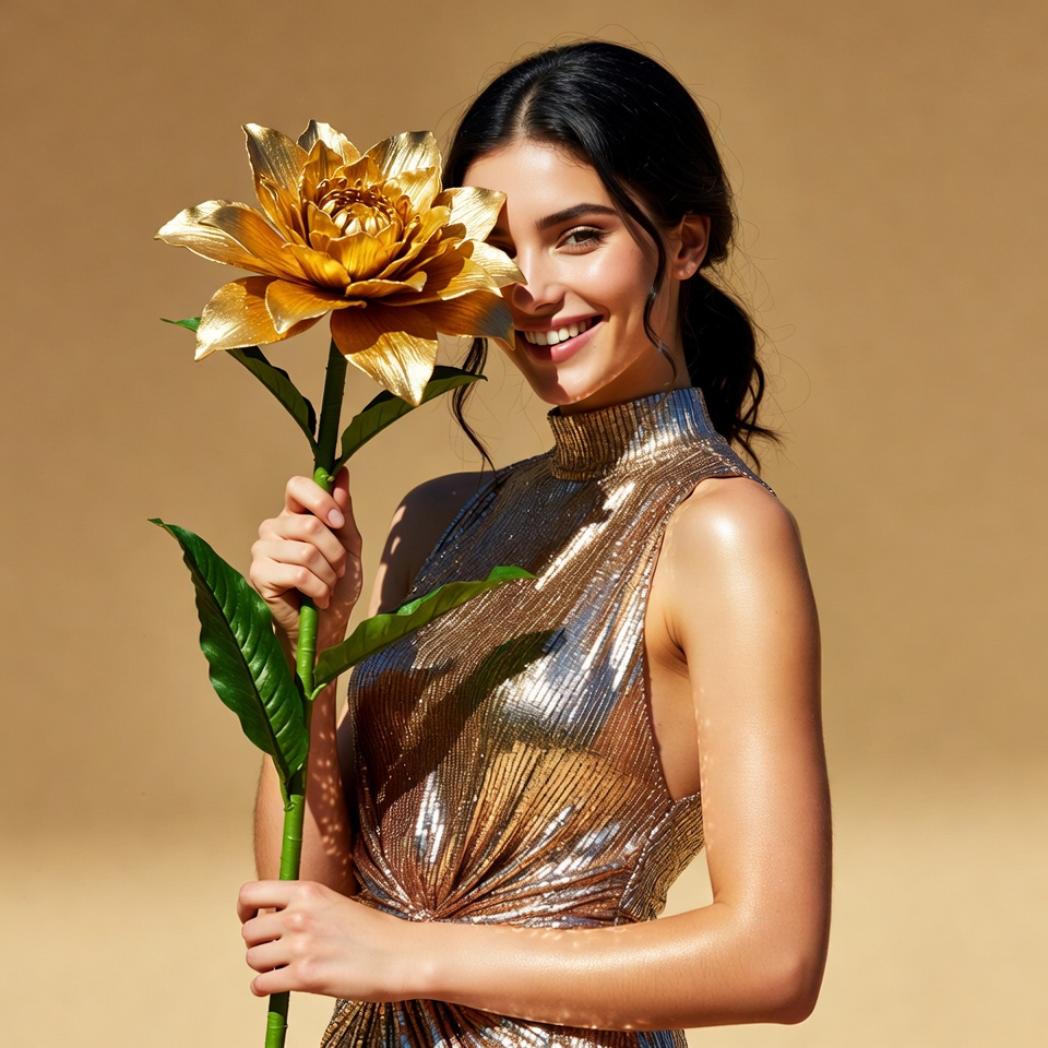 Model holds a large golden flower while smiling. The background is a plain light color. The setting appears bright and focuses on the model's outfit.
