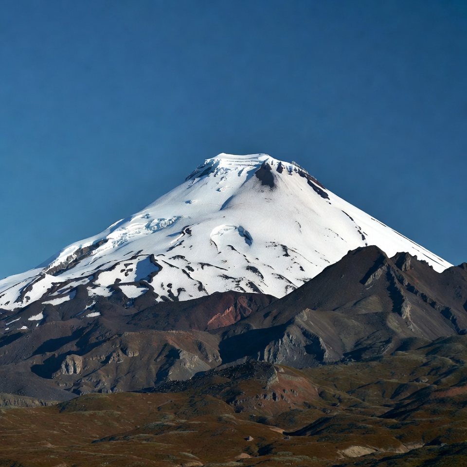 Snow-covered mountain stands tall under a clear blue sky. The landscape shows rocky terrain and distant hills.