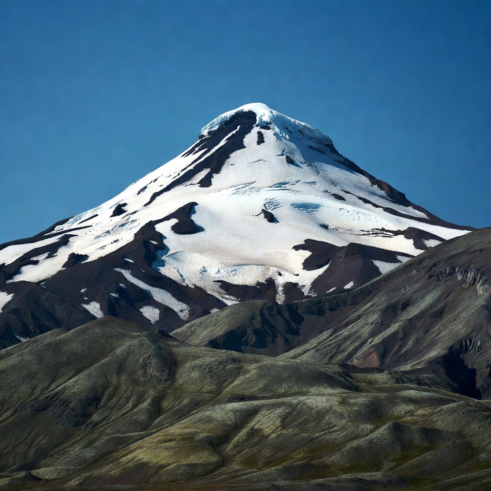 A tall mountain shows its snowy peak under a blue sky. The slope is rocky and bare, with no trees visible around the base.
