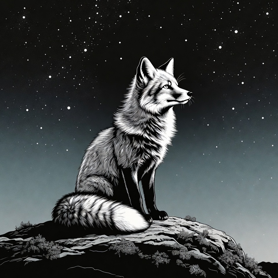 A fox is sitting on a rock, looking up at a sky full of stars. The scene captures nighttime, showcasing wild beauty in nature.
