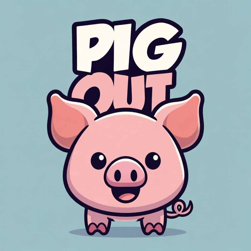 A cartoon pig stands smiling with a simple background. The pig seems happy, inviting viewers to enjoy food or fun activities.