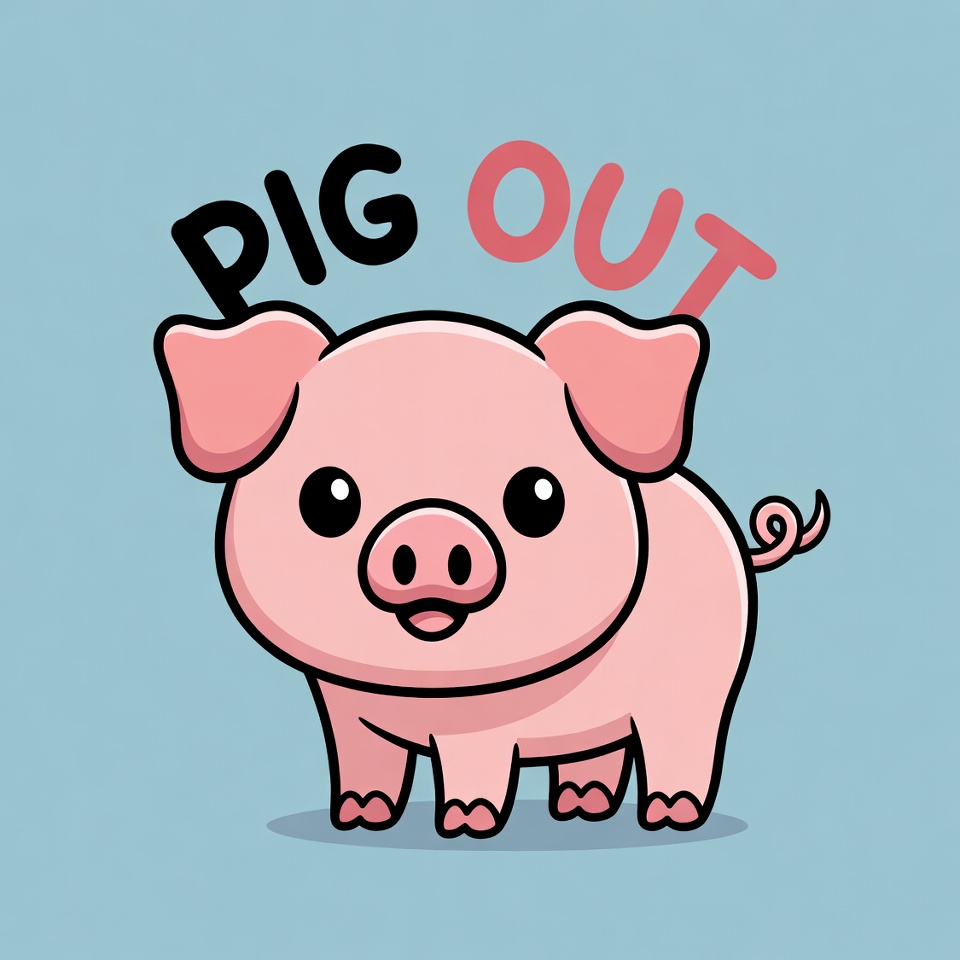 A cute cartoon pig stands happily next to the words Pig Out in a playful design set against a simple background.