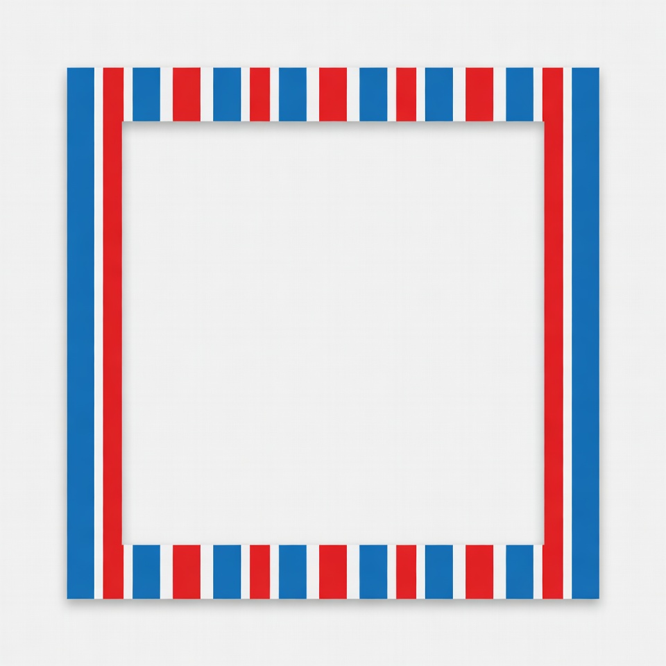 A picture frame with red and blue stripes surrounds an empty space. It stands ready for a photo or artwork. This design is simple and bright.