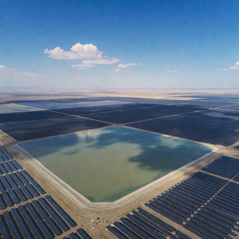 aerial view, agriculture, blue sky, clear skies, desert landscape, electricity, energy production, environmental impact, green technology, land use, nature, power generation, renewable energy, saltwater pond, solar farm, solar panels, sunlight, sustainable energy, technology, water body