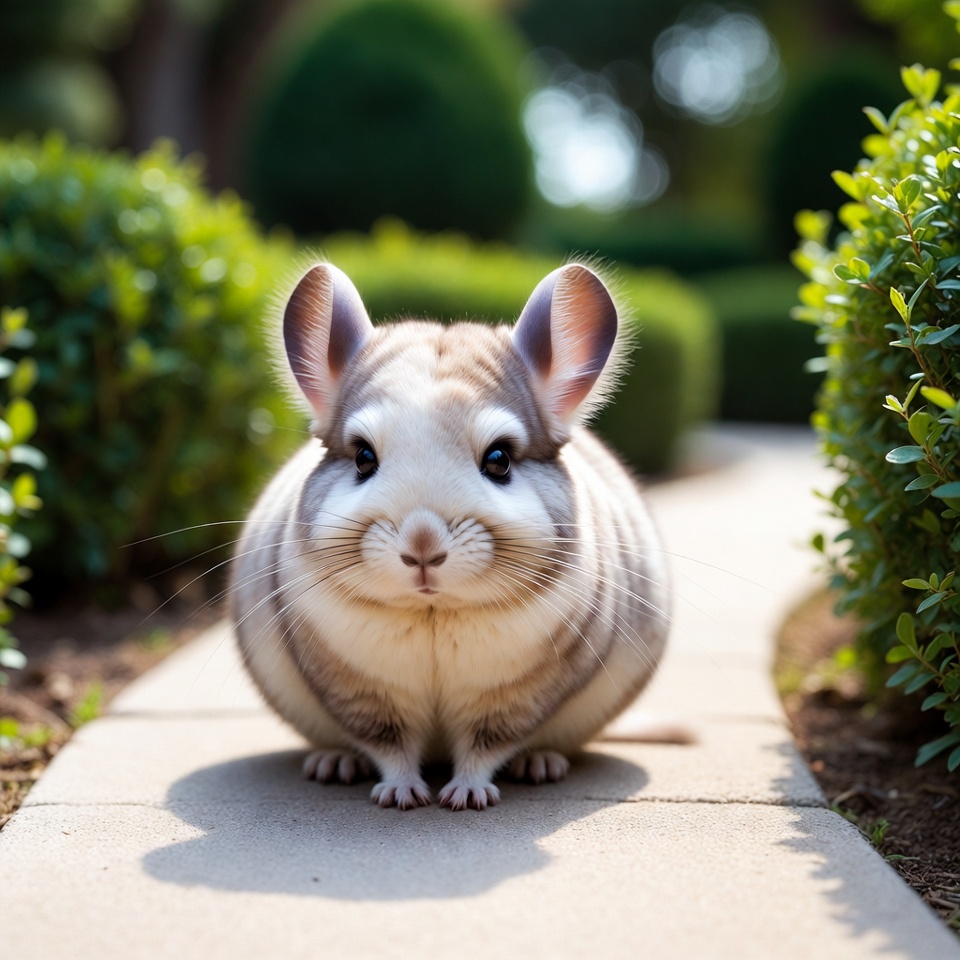 A chinchilla sits on a stone path, surrounded by neatly trimmed bushes in a garden during daylight. It looks curiously at its surroundings.