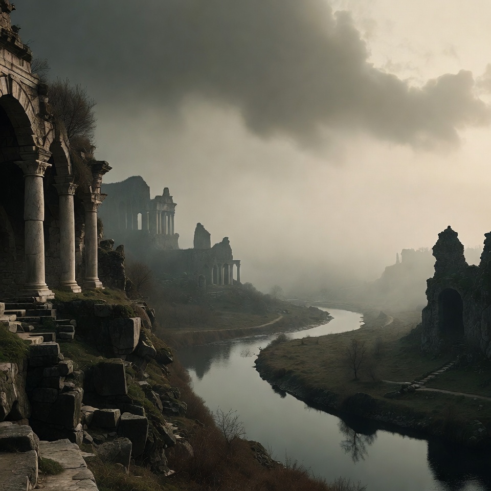 Old stone structures stand near a river as fog covers the landscape. The scene shows a quiet moment in a forgotten place, evoking history.