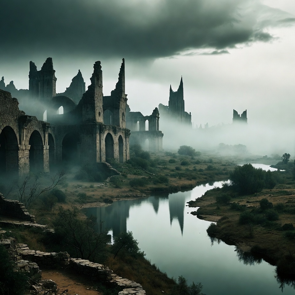 Old stone structures stand near a river. Mist covers the ground. Dark clouds loom above, creating a mysterious scene at dusk.
