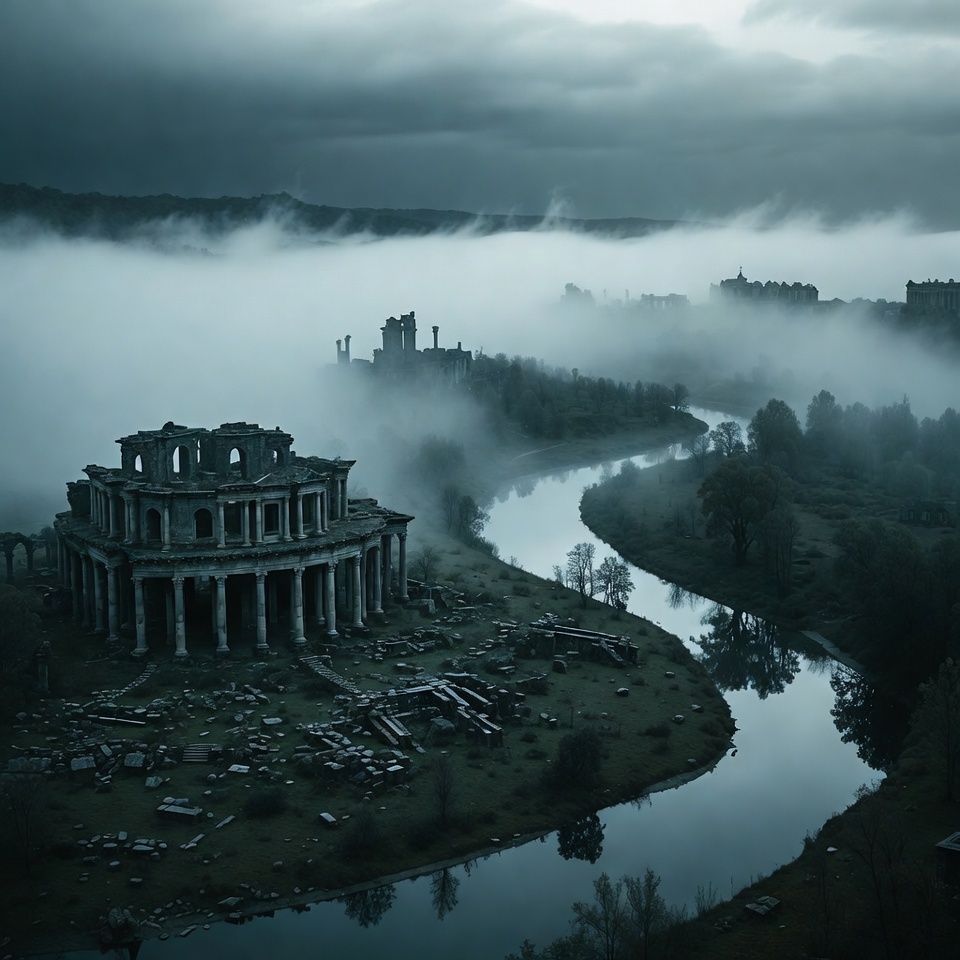 A view of ancient ruins next to a winding river covered in fog. The landscape shows trees and distant structures under dark clouds.