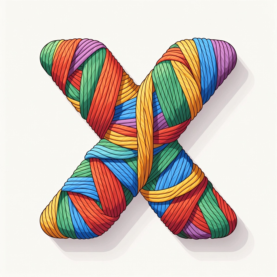 Bright yarn pieces are twisted together to form a cross shape. The colors include red, yellow, green, blue, and purple.