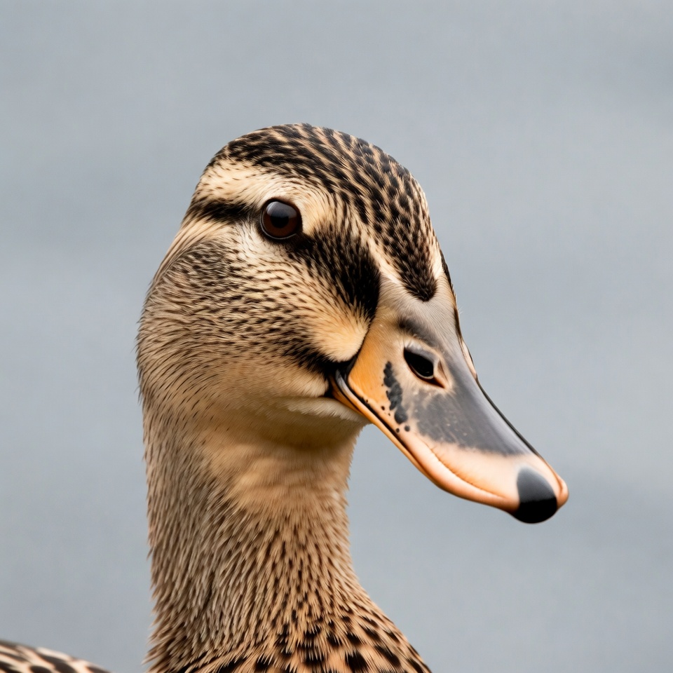 A duck stands out with its detailed feathers and expressive eyes. The background shows a simple, blurred environment.