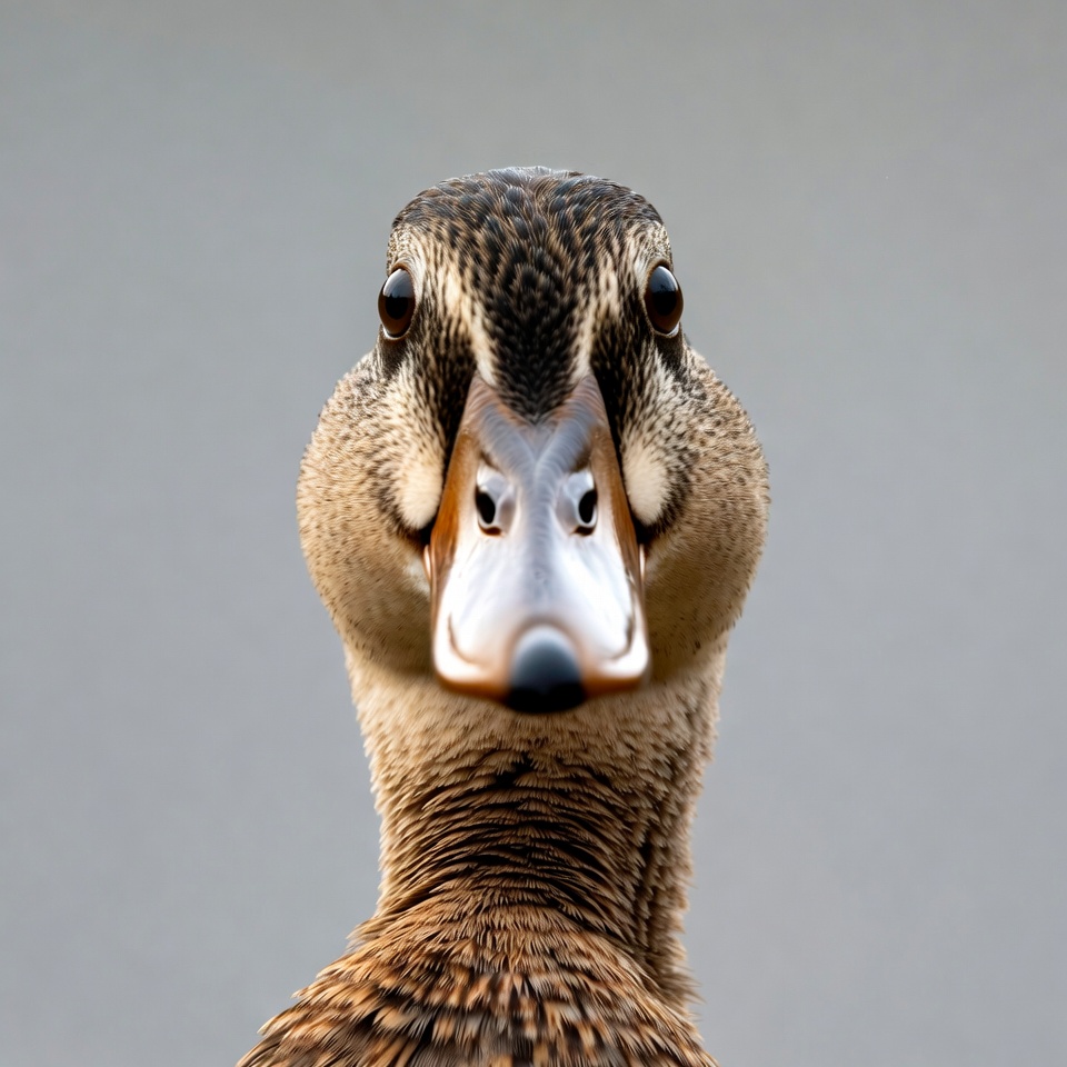 A duck looks directly at the camera with a neutral background. It is standing still in a natural setting, focused and alert.