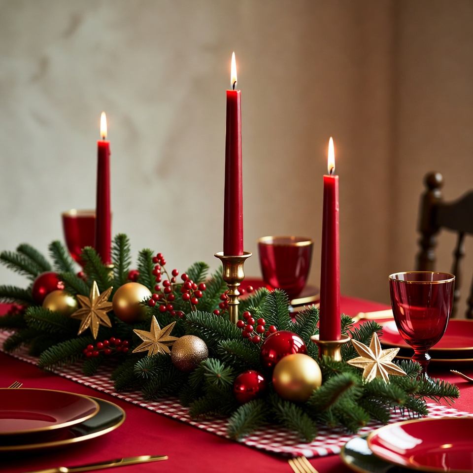 Three red candles burn on a festive table. Greenery, gold ornaments, and red accents create a holiday setting for a meal.