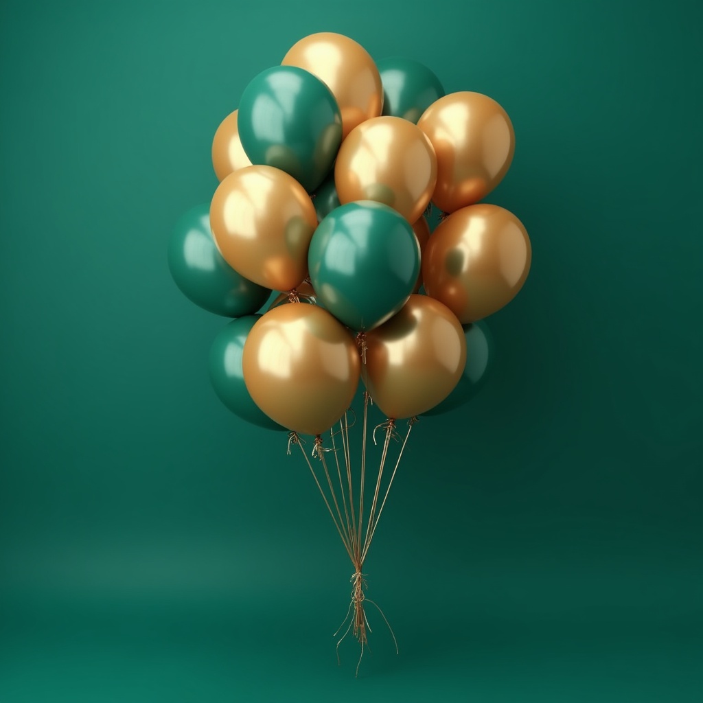 Green and gold balloons are grouped together. They have a shiny surface and are held by strings. The background is solid green.