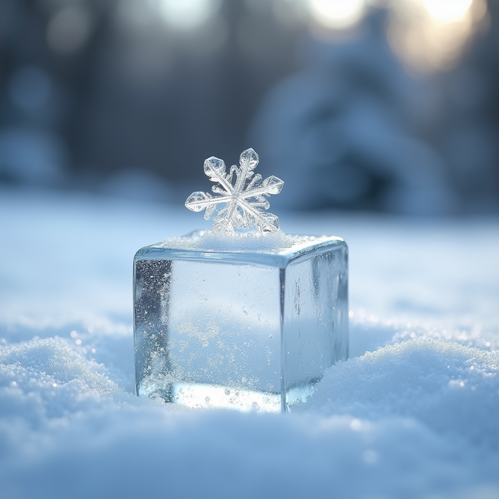 An ice cube sits on snow, featuring a snowflake resting on its surface. The scene captures the clear textures of ice and snow.