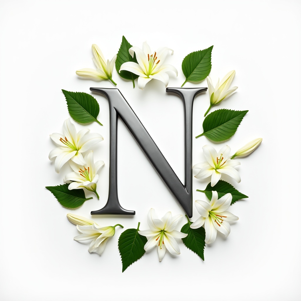 The letter N is placed in the center, surrounded by white flowers and green leaves on a plain background, creating a natural look.
