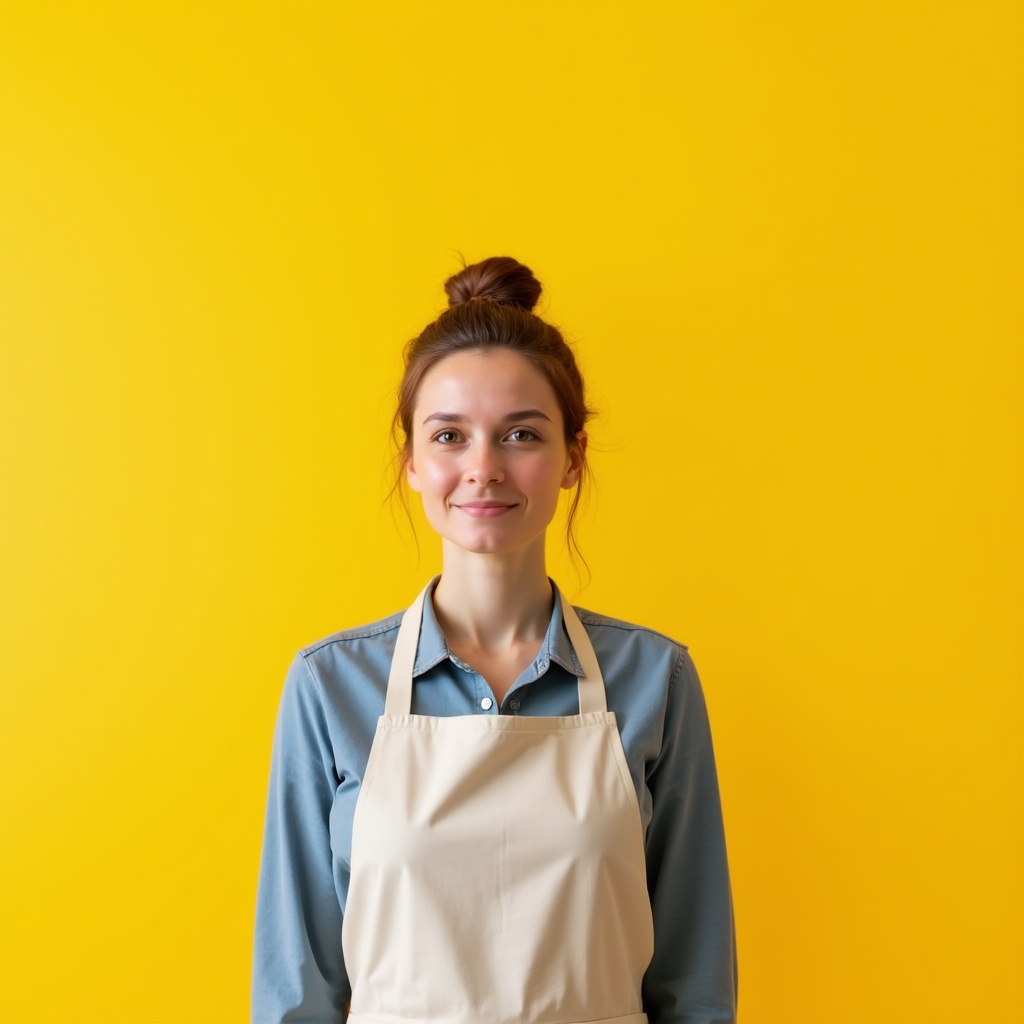 apron, background, bright, cafe, casual, cheerful, clothes, customer, employee, friendly, hospitality, indoor, person, portrait, service, shop, smiling, standing, woman, yellow wall