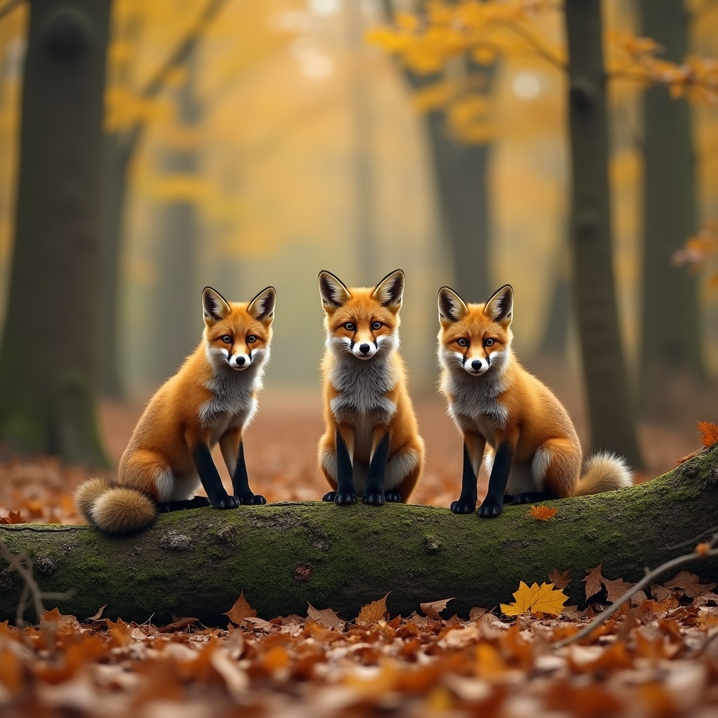 Three foxes sit together on a log in a forest with fallen leaves. The trees around are tall and have orange and brown leaves.