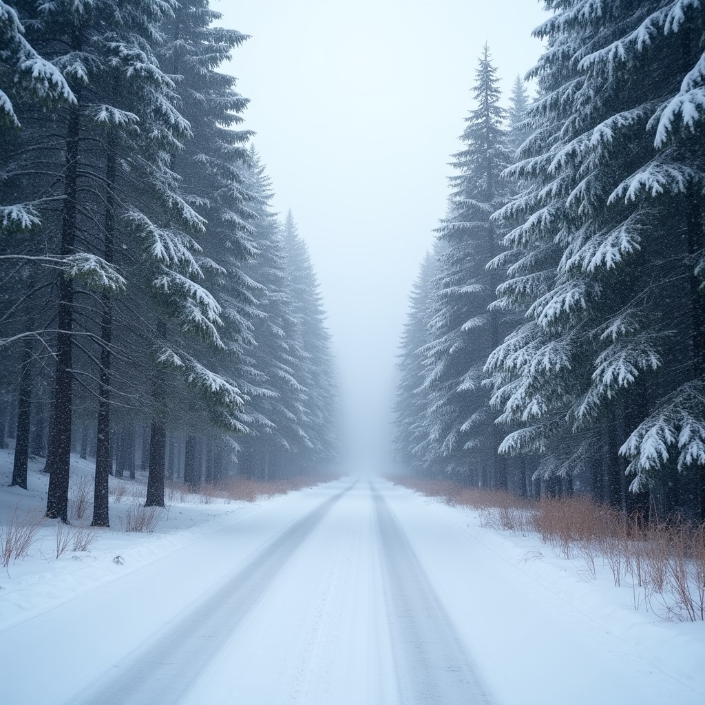 A snow-covered road runs through tall trees in a forest. The scene is foggy and cold, with snow falling gently around.