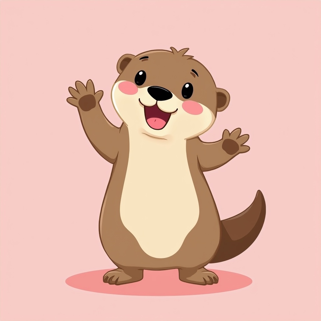 A cartoon otter smiles and waves with both paws raised. The otter has pink cheeks and stands on a light pink background.