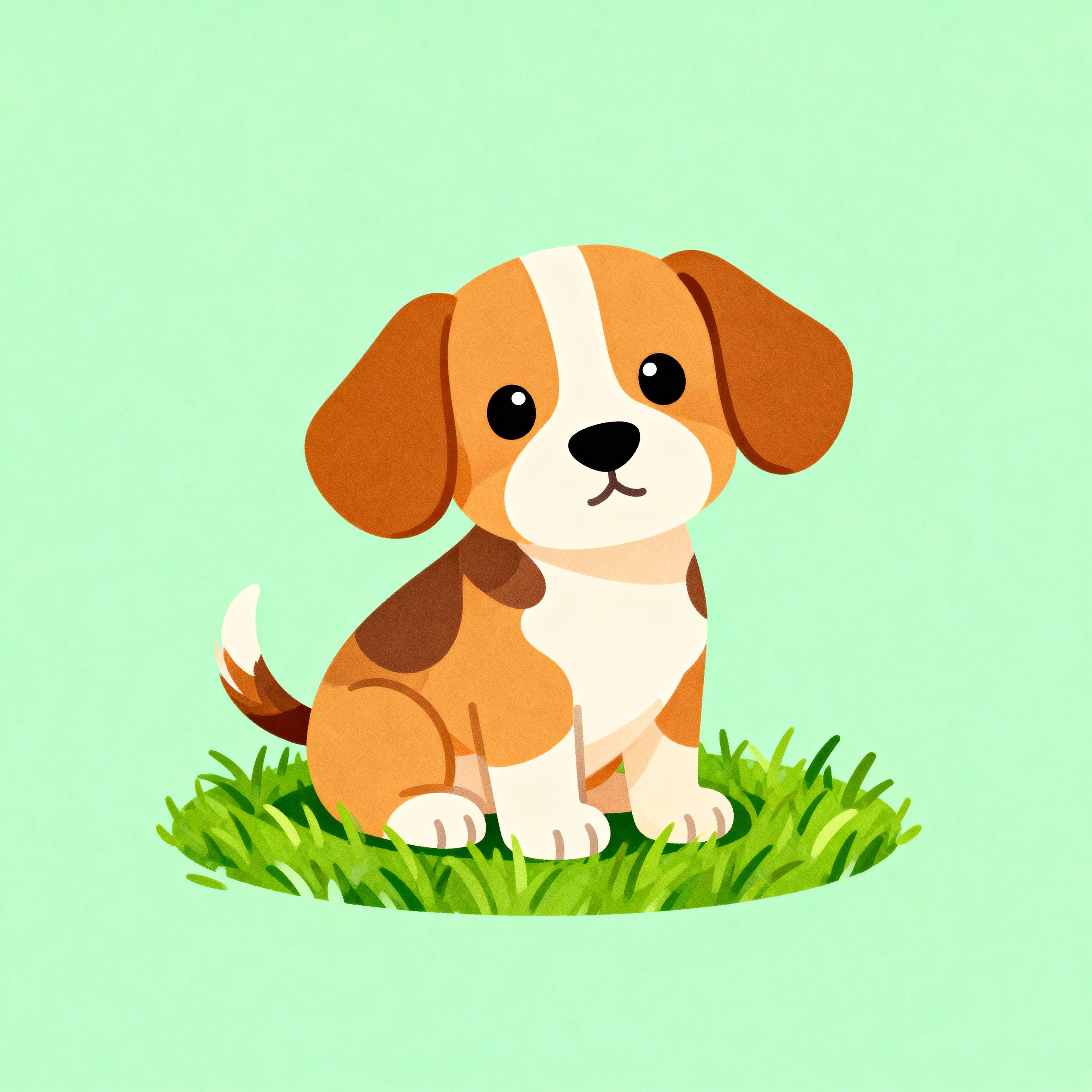 A cute cartoon puppy with brown and white fur sits on a patch of green grass against a light green background. The puppy looks at the viewer.