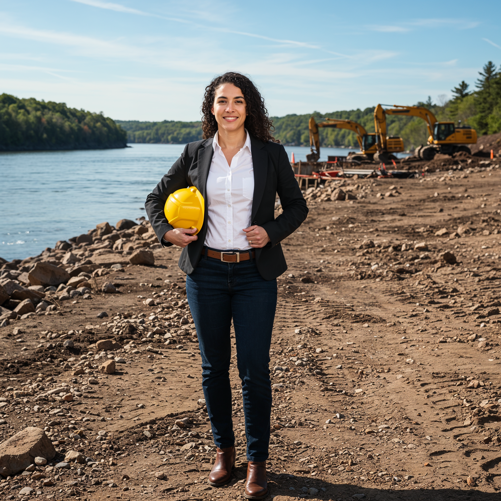 A woman in a jacket holds a yellow hard hat. Heavy machinery stands near a waterfront location. The weather is sunny.
