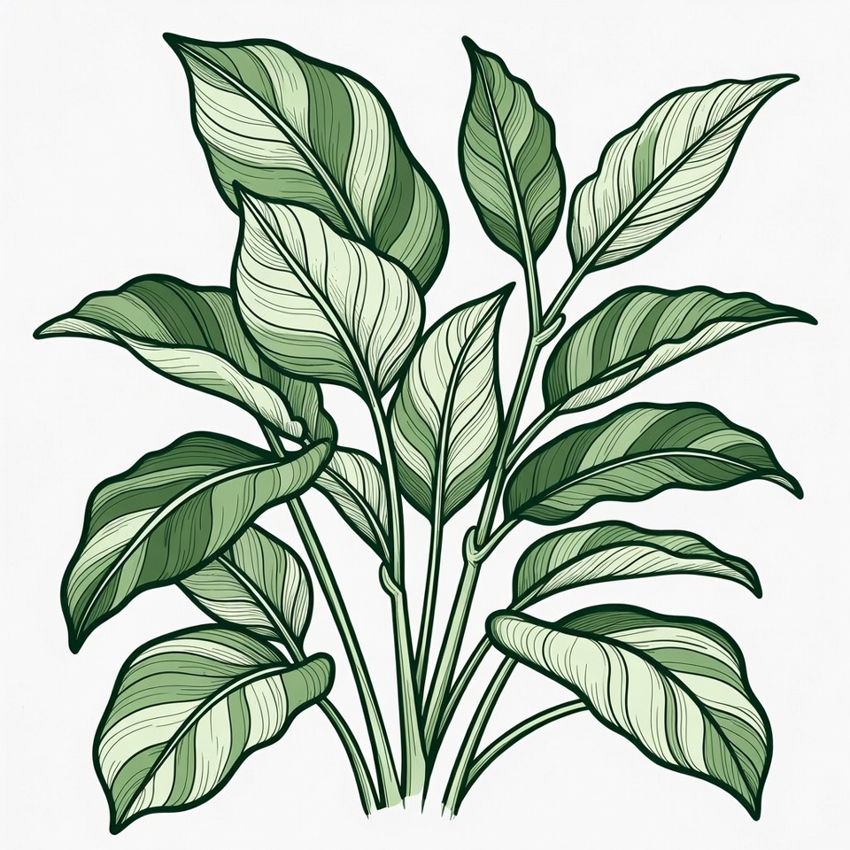 A cluster of green leaves stands upright with various shapes and sizes. The design highlights the natural patterns and textures of the leaves.