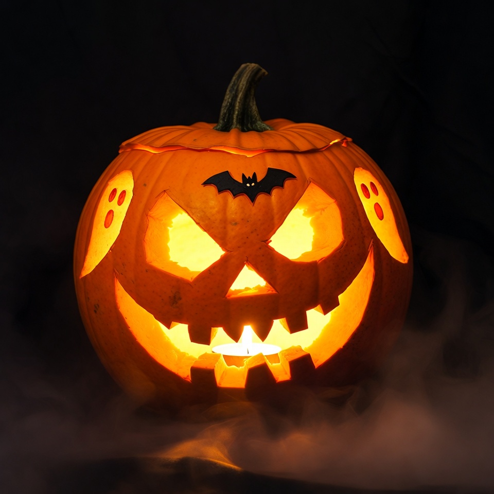 A carved pumpkin displays a spooky face with a bat on top, lit from inside. The pumpkin is surrounded by fog and darkness.