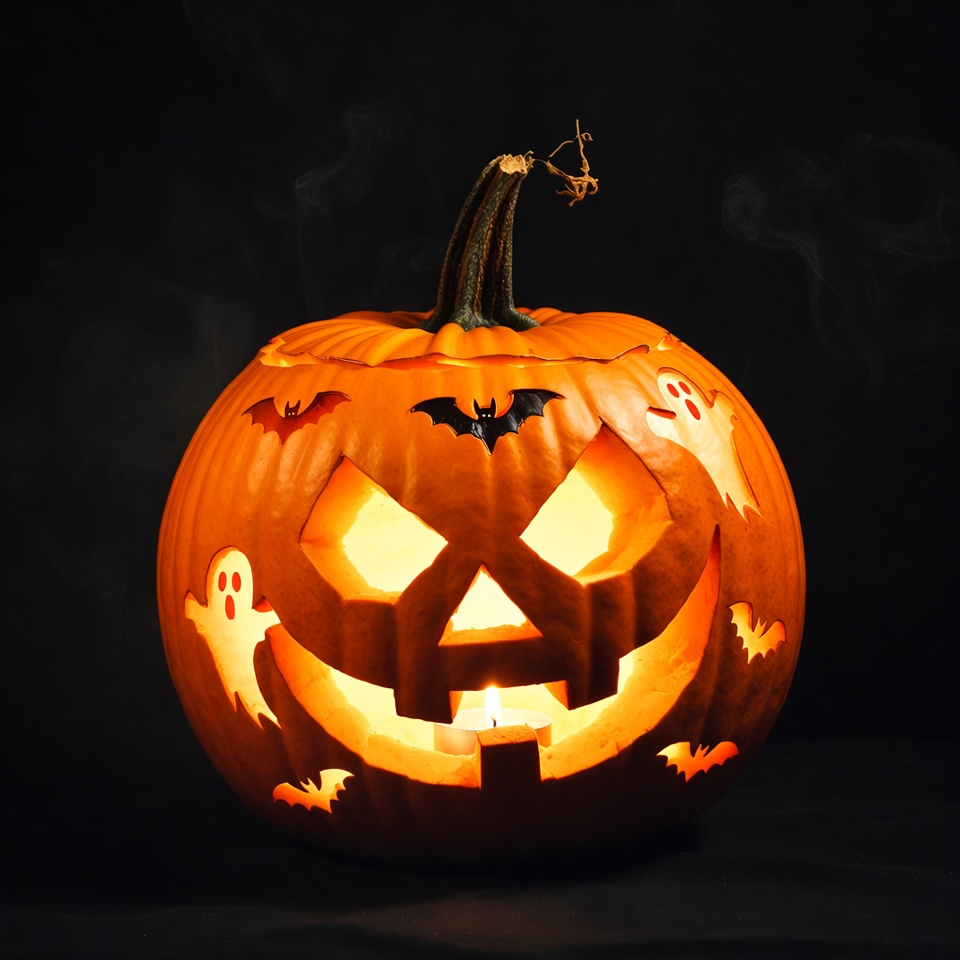 A pumpkin is carved with a face, bats, and ghosts. A candle is inside, making the pumpkin glow in the dark.