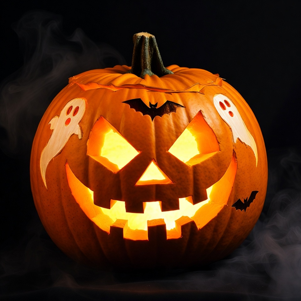 Pumpkin carved with a face, decorated with ghost and bat cutouts, illuminated from inside. The setting has a dark background with smoke.