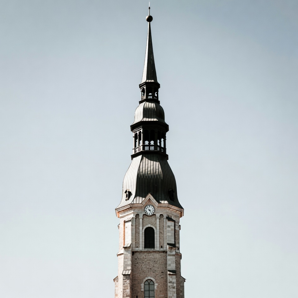 A tall stone tower rises into a blue sky. It features a prominent spire and clock. The scene shows a quiet moment in the surroundings.