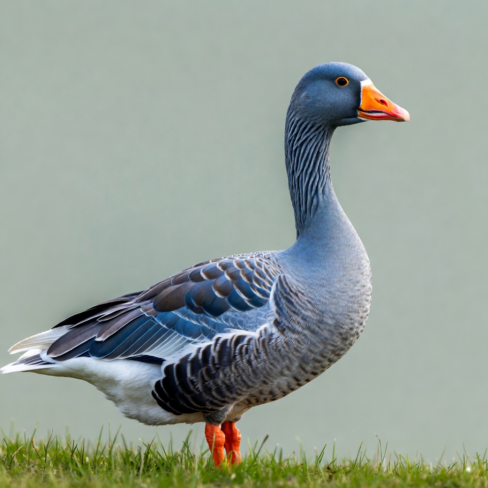 A goose with orange beak and gray feathers stands on the grass. The background is plain and emphasizes the bird's details.