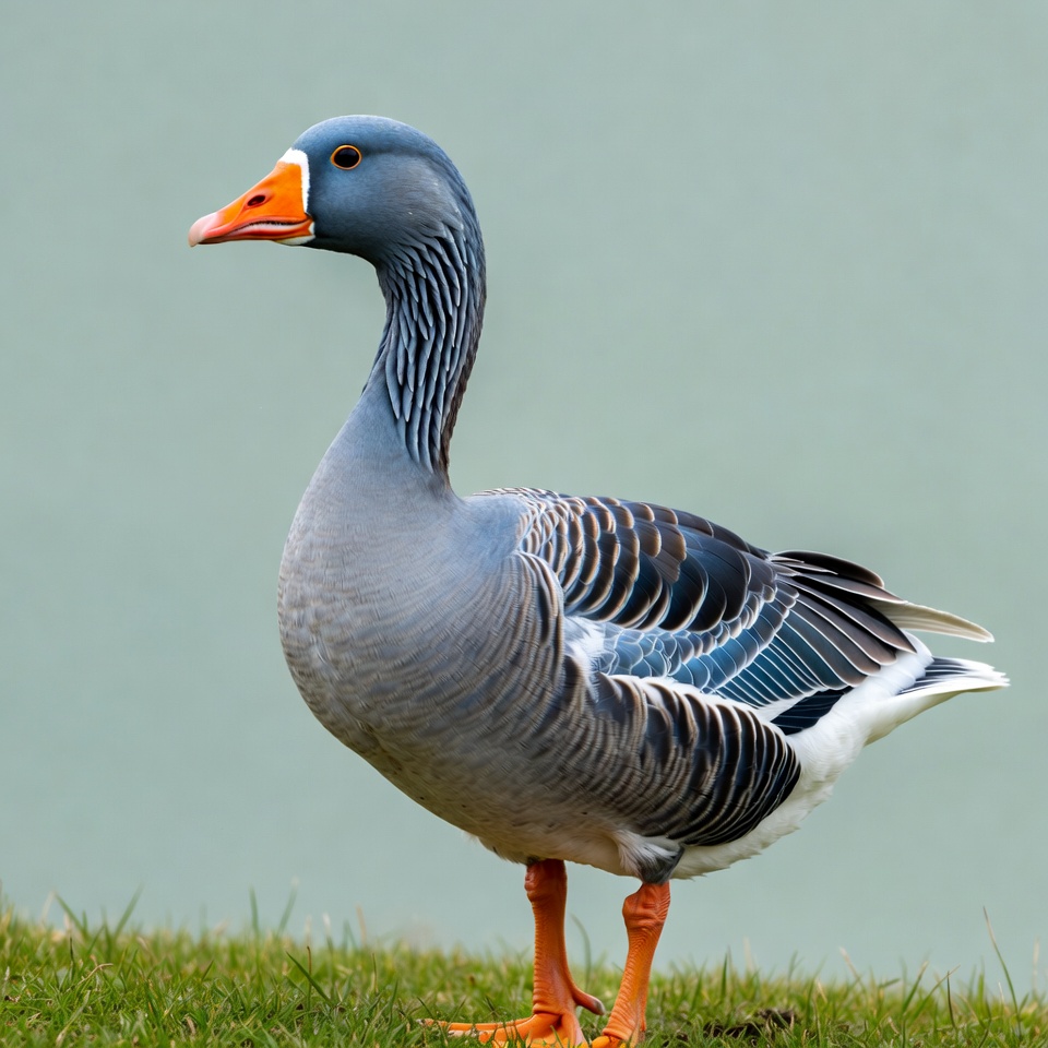 animal, animal behavior, avian, beak, birds, blue, day, feathers, goose, grass, gray goose, green, natural habitat, nature, orange, outdoors, poultry, standing, waterfowl, wildlife