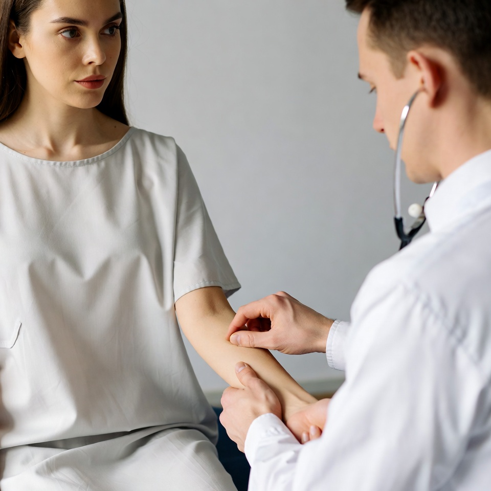 A doctor conducts an examination on a patient's arm during a consultation in a medical clinic setting.