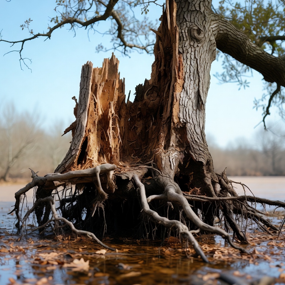 A large tree stump stands in shallow water with exposed roots. Surrounding land is bare, and the scene shows early signs of spring.