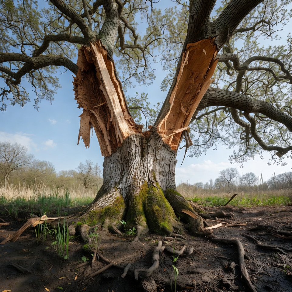 bark, broken trunk, clouds, damaged, environment, foliage, forest, grass, growth, landscape, muddy ground, nature, outdoor, roots, scenery, storm, tree, vegetation, wetland, wildlife