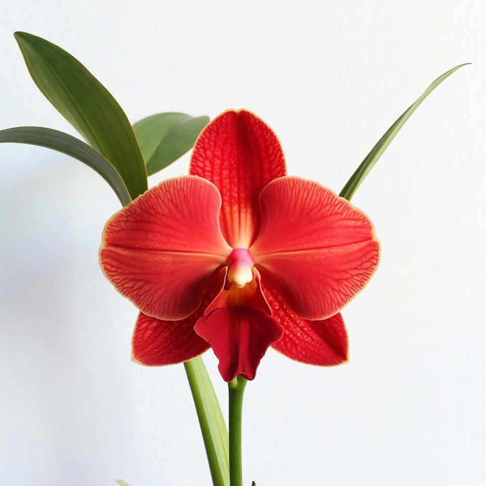 A red orchid flower stands out against a white background. The plant has green leaves and shows bright colors as it blooms.