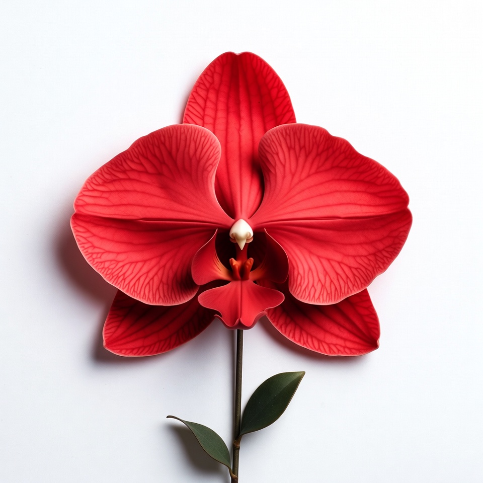 A red orchid is displayed on a white surface. The flower shows detailed petals and green leaves. Its vibrant color stands out against the background.